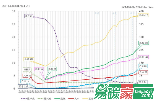 碳排放總體規(guī)??梢钥闯?,“能產(chǎn)比”,即當(dāng)年能耗與當(dāng)年GDP產(chǎn)值的比率,從60年代到90年代迅速降低,到了1994年后基本拉平。2008年以后基本沒有什么大的改進,當(dāng)然有因為技術(shù)提升帶來較小程度的改進,目前我們還不知道這是不是就是最低線。