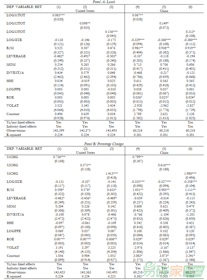 表1:碳排放和股票收益:美國和中國