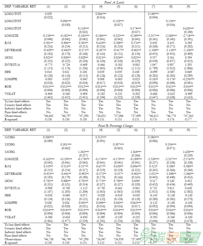模型(1)衡量了公司的年度總排放量對股票月度收益的影響,模型(2)則估計了公司年度總排放量的百分比變化對其股票月度收益的影響。