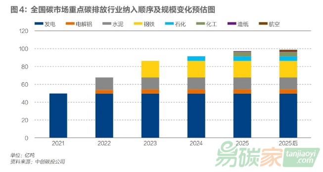 航空等七大高耗能行業(yè)全部納入全國碳市場,碳排放總量預計在80億/年噸至100億噸/年之間。