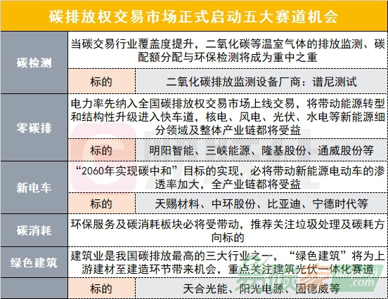 航空等。西南證券朱斌結合碳交易對各類行業(yè)可能形成的影響,梳理出了五大賽道的投資機會: