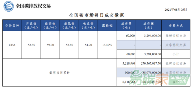 碳市場(chǎng)碳排放配額(CEA)累計(jì)成交量6,118,964噸,累計(jì)成交額308,643,037.70元。