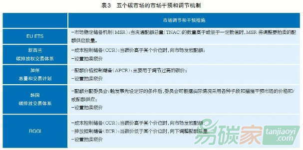 也正因如此,通常需要建立價格或配額供應(yīng)的調(diào)節(jié)和干預(yù)機(jī)制來防范市場波動風(fēng)險。如表3所示,五個典型的碳市場都發(fā)展了各自的市場調(diào)節(jié)和干預(yù)措施,包括設(shè)置價格上下限和基于一定條件或規(guī)定的調(diào)節(jié)機(jī)制,有效防止價格過高或者過低的風(fēng)險。這些措施可以在一定水平和時間范圍內(nèi)維持碳價的可預(yù)見性,而一個穩(wěn)健且不斷上升的碳價信號可以激勵低碳投資并降低其回報風(fēng)險,推動全社會持續(xù)減少溫室氣體排放。