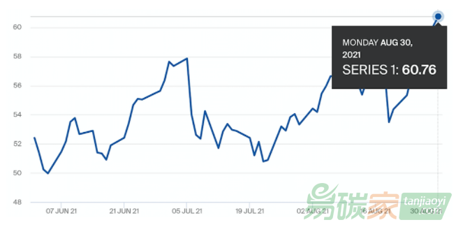 30日,歐盟碳價突破60歐元/噸大關。 數(shù)據(jù)來源:ICE