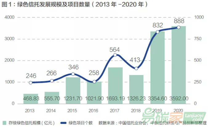 中國(guó)信托業(yè)協(xié)會(huì)2019年發(fā)布了《綠色信托指引》,成為首部指導(dǎo)綠色信托業(yè)務(wù)發(fā)展的行業(yè)自律規(guī)范。經(jīng)過近年來不斷的研究與實(shí)踐,綠色信托業(yè)務(wù)模式日益豐富,創(chuàng)新推出了多種綠色信托產(chǎn)品,主要包括:綠色信貸、綠色股權(quán)投資、綠色資產(chǎn)證券化、綠色供應(yīng)鏈、綠色產(chǎn)業(yè)基金綠色權(quán)益市場(chǎng)交易、綠色(公益)慈善信托等,為綠色低碳環(huán)保產(chǎn)業(yè)提供了優(yōu)質(zhì)的金融整合服務(wù)。綠色信托的資產(chǎn)規(guī)模從2013年末468.83億元快速增長(zhǎng)至2020年末的3592億元,存續(xù)綠色信托項(xiàng)目888個(gè),其中,2020年新增綠色信托項(xiàng)目360個(gè),新增規(guī)模近1200億元。這充分說明綠色信托的經(jīng)濟(jì)價(jià)值、社會(huì)價(jià)值和環(huán)境價(jià)值愈發(fā)促成信托行業(yè)的共識(shí)和共建,成為信托行業(yè)服務(wù)實(shí)體經(jīng)濟(jì)的顯著本源業(yè)務(wù)。