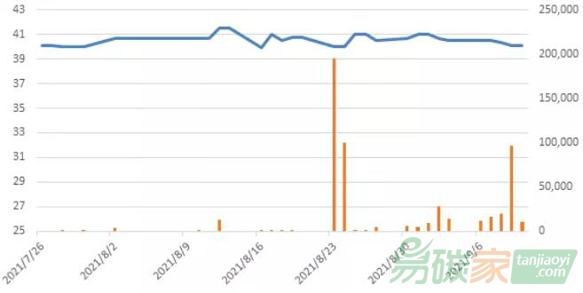 碳配額(SHEA)現(xiàn)貨市場(chǎng)線上成交156,067噸,較上周有大幅提升,協(xié)議轉(zhuǎn)讓無(wú)成交。成交方面,每日均有掛牌成交且交易量有所擴(kuò)張,其中周四成交96,318噸。價(jià)格方面,SHEA價(jià)格小幅持續(xù)下跌,周五報(bào)收40.05元/噸,較上周五同比下跌0.49元/噸(如圖1)。