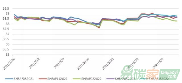 本報(bào)告期內(nèi)(2021年9月6日至2021年9月10日),上海碳配額遠(yuǎn)期(SHEAF)中央對(duì)手清算業(yè)務(wù)保持平穩(wěn)運(yùn)行。本周遠(yuǎn)期市場(chǎng)流通協(xié)議價(jià)格窄幅波動(dòng)下跌,其中2021年11月協(xié)議期末結(jié)算價(jià)為38.70元/噸,較上周五同比下跌0.34元/噸,2022年2月協(xié)議期末結(jié)算價(jià)38.30元/噸,較上周五同比下跌0.45元/噸(如圖2)。