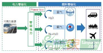 燃料零碳化是以太陽能、風能等可再生能源為主要能量制取可再生燃料,包括氫、氨和合成燃料等?;诹闾?a target="_blank" class="relatedlink">電力的可再生燃料制?。▓D?7),將創(chuàng)建一種全新的“源-儲-荷”離線可再生能源利用形式,有望使