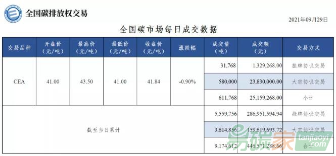 市場碳排放配額(CEA)掛牌協(xié)議交易成交量31,768噸,成交額1,329,268.00元,開盤價(jià)41.00元/噸,最高價(jià)43.50元/噸,最低價(jià)41.00元/噸,收盤價(jià)41.84元/噸,收盤價(jià)較前一日下跌0.90%。今日大宗協(xié)議交易成交量580,000噸,成交額23,830,000.00元。今日全國碳排放配額(CEA)總成交量611,768噸,總成交額25,159,268.00元。