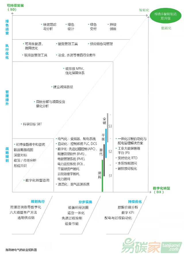 這樣的“零碳工廠”,如何能遍地開花?施耐德電氣給出的答案是:碳金矩陣。它提供了一種可診斷、可實(shí)施、可優(yōu)化的全局性思路,給出了可持續(xù)發(fā)展和數(shù)字化轉(zhuǎn)型兩大維度的布陣,并配備了精良的組合工具庫。