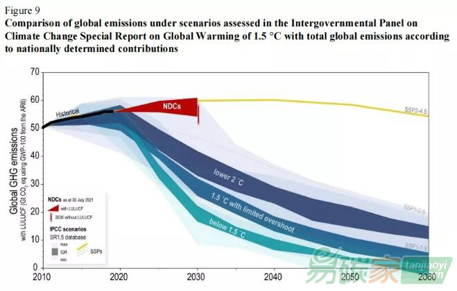 碳排放量與所達(dá)成目標(biāo)關(guān)系圖。其中NDC為國(guó)家自主貢獻(xiàn)。圖源自報(bào)告