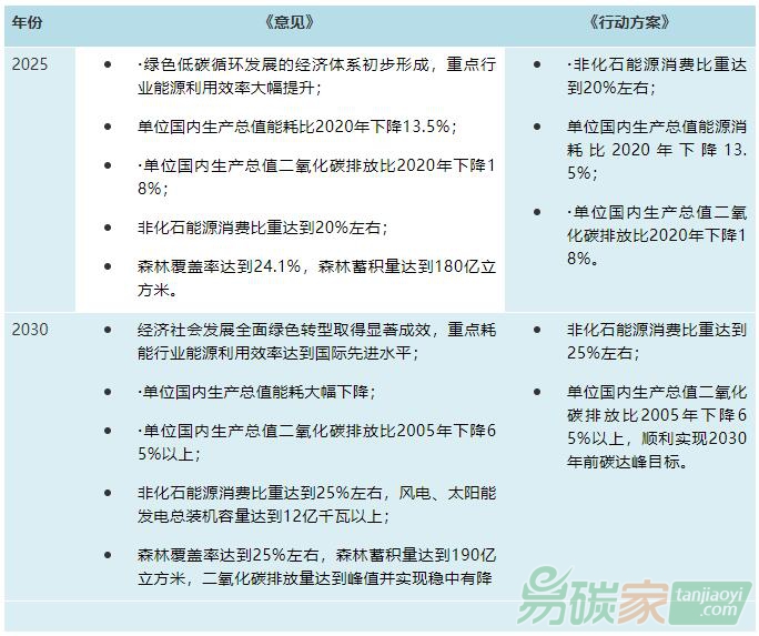 碳匯能力等五個(gè)方面主要目標(biāo)?!缎袆?dòng)方案》聚焦“十四五”和“十五五”兩個(gè)碳達(dá)峰關(guān)鍵期,提出了提高非化石能源消費(fèi)比重、提升能源利用效率、降低二氧化碳排放水平等方面主要目標(biāo)。具體的目標(biāo)見表1。