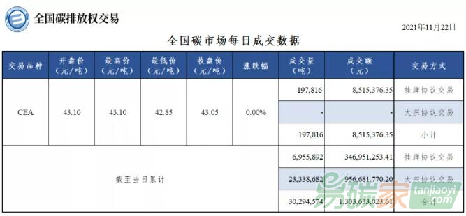 市場碳排放配額(CEA)掛牌協(xié)議交易成交量197,816噸,成交額8,515,376.35元,開盤價(jià)43.10元/噸,最高價(jià)43.10元/噸,最低價(jià)42.85元/噸,收盤價(jià)43.05元/噸,收盤價(jià)與前一日持平。今日無大宗協(xié)議交易。今日全國碳排放配額(CEA)總成交量197,816噸,總成交額8,515,376.35元。