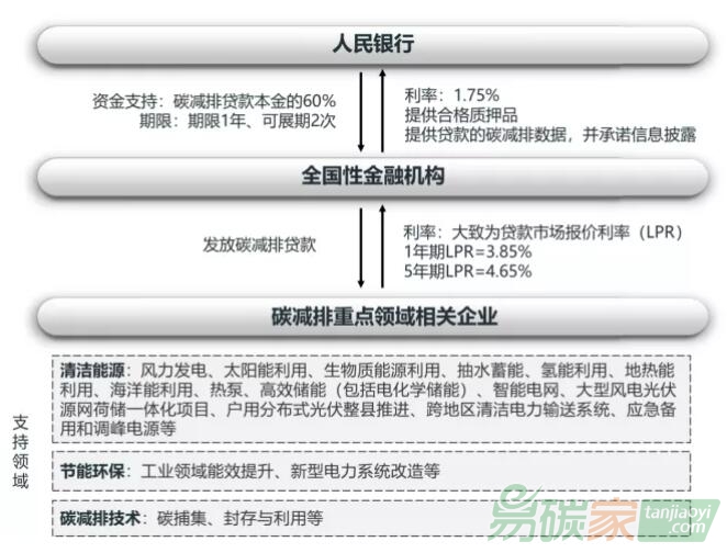 市場(chǎng)報(bào)價(jià)利率(LPR)大致持平;再向人民銀行按貸款本金的60%申請(qǐng)?zhí)紲p排支持工具的資金支持,利率為1.75%。金融機(jī)構(gòu)申請(qǐng)?zhí)紲p排支持工具不僅需要向人民銀行提供合格質(zhì)押品,同時(shí)還需要提供貸款的碳減排數(shù)據(jù),并承諾對(duì)公眾進(jìn)行信息披露。碳減排支持工具的流程機(jī)制以及細(xì)節(jié)要求如下圖所示: