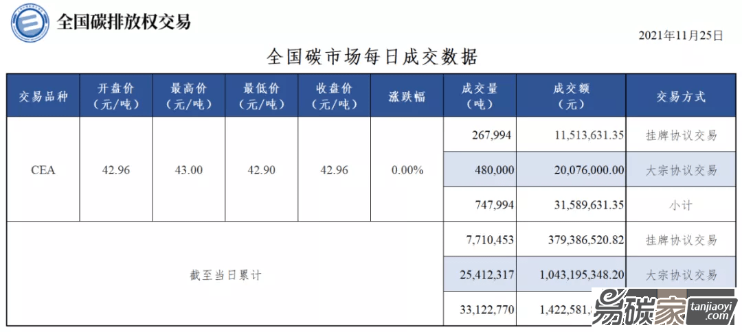 根據(jù)上海能源環(huán)境交易所數(shù)據(jù),截至11月25日,全國(guó)碳
