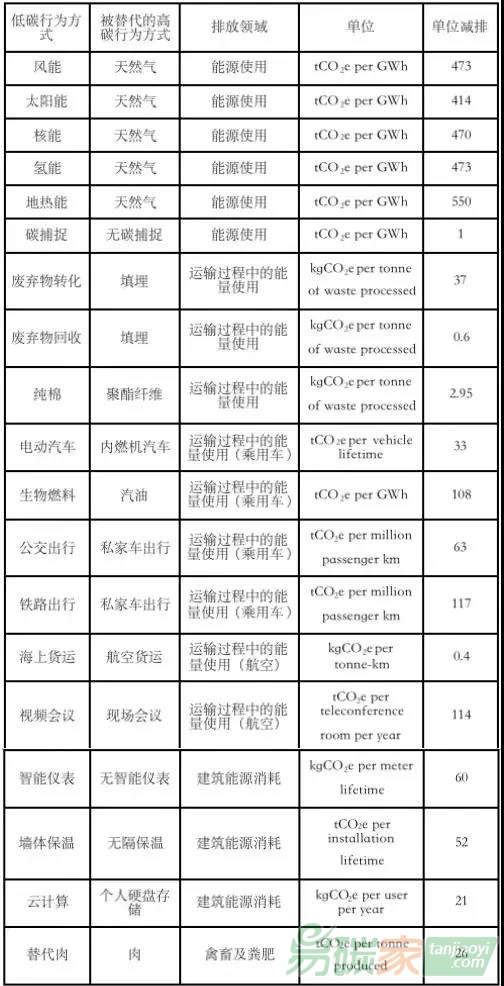 表1列舉了19類(lèi)低碳、零碳行為活動(dòng)替代高碳行為活動(dòng)(現(xiàn)存或到2030年預(yù)測(cè)市場(chǎng)規(guī)模能夠達(dá)到1000億美元的行業(yè))的碳減排路徑及單位減排量測(cè)算。其中一些行業(yè)看起來(lái)并不“低碳”或和“低碳”并無(wú)關(guān)聯(lián),例如海上貨運(yùn)、智能儀表、云計(jì)算等。然而這些產(chǎn)業(yè)、行為方式所帶來(lái)的碳規(guī)避型減排量及金融化收益都是正向的。圍繞這些產(chǎn)業(yè)為其提供配套的專(zhuān)業(yè)設(shè)計(jì),設(shè)備制造,技術(shù)支持乃至原材料供應(yīng)同樣會(huì)為減碳進(jìn)程做出不同程度貢獻(xiàn)。