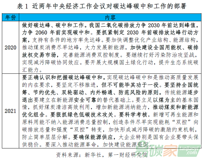 從表1可以看出,今年中央經(jīng)濟工作會議關(guān)于碳達(dá)峰碳中和的部署不僅篇幅上遠(yuǎn)超去年,而且從內(nèi)容來看變化較大。2020年中央經(jīng)濟會議主要是提出目標(biāo)和布置具體的工作要求?,F(xiàn)在回過頭來看,其中一些已經(jīng)在2021年落實,如7月16日全國