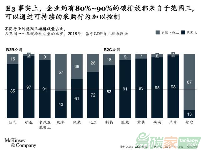 航空業(yè)以外,大部分企業(yè)約80%~90%的碳排放均來(lái)自范圍三,有望通過(guò)可持續(xù)的采購(gòu)行為加以控制(如圖3)。