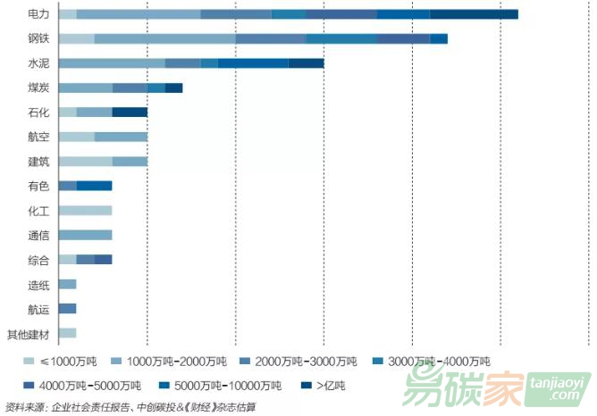 分行業(yè)來(lái)看,電力、水泥、鋼鐵三大行業(yè)的排放總量規(guī)模相對(duì)更大。其中,電力與水泥行業(yè)的公司更是占據(jù)了總量榜前五名。