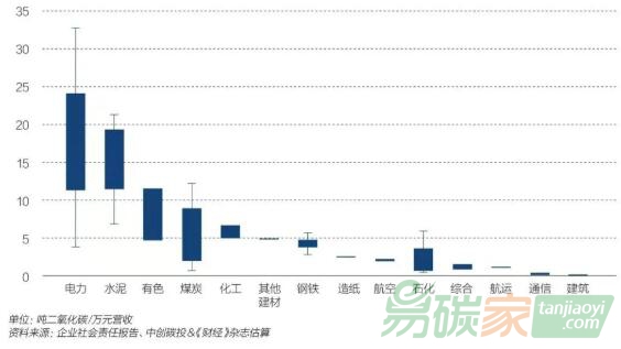 從行業(yè)強(qiáng)度分布圖可看出,電力、水泥的排放強(qiáng)度要遠(yuǎn)高于其他行業(yè)。鋼鐵行業(yè)雖然排放總量較多,但強(qiáng)度相對(duì)較小。而