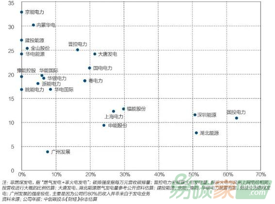 在我們的榜單中,那些非燃煤發(fā)電占比較高的企業(yè),碳排放強(qiáng)度相對(duì)較小。(見(jiàn)圖5)主要原因有兩點(diǎn):一是我們?cè)谟?jì)算強(qiáng)度時(shí),統(tǒng)一以全部營(yíng)收作為除數(shù)。非火電業(yè)務(wù)的營(yíng)收增大了分子。二是燃?xì)獾膯挝慌欧帕肯鄬?duì)較小,氣電比例增大,排放量會(huì)相對(duì)降低,減少了分母。