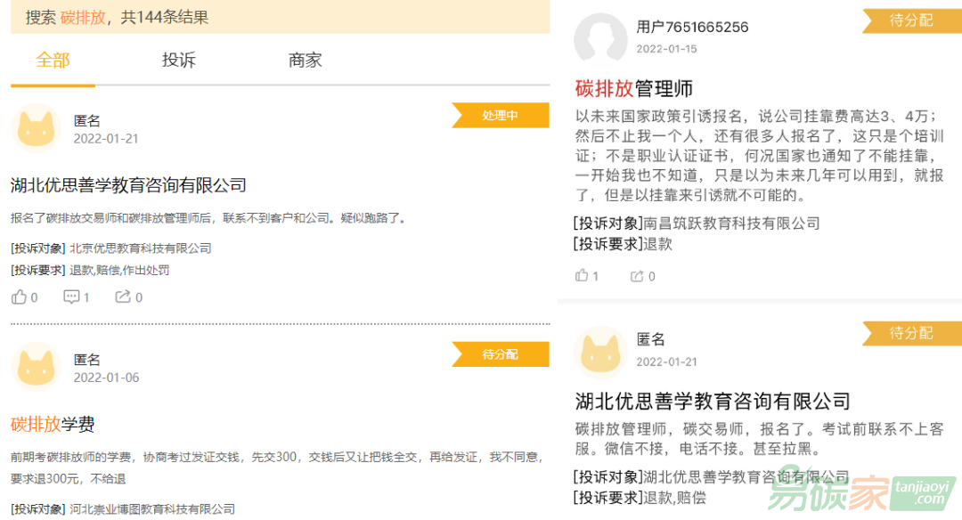 認(rèn)證。他查詢(xún)了該網(wǎng)站,沒(méi)有找到碳排放管理員考試的信息;倒是在黑貓投訴平臺(tái)搜索“碳排放”時(shí),找到了144條投訴結(jié)果。