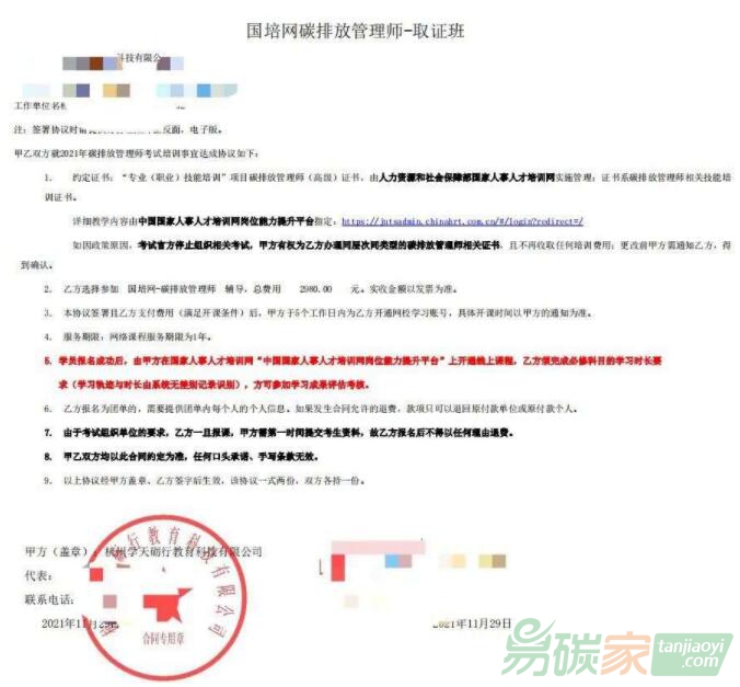 “業(yè)務(wù)員說碳排放管理證書經(jīng)中國人事網(wǎng)認證。付款后出示的合同上寫的是‘國培網(wǎng)’輔導(dǎo)?!彼杏X不對勁,第二天便聯(lián)系業(yè)務(wù)員要求退款。