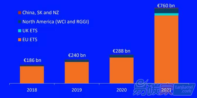 圖:全球各大碳市場(chǎng)2018-2021成交總額一覽