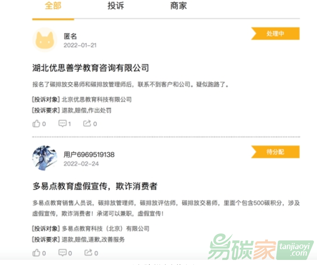 近日,貝殼財經(jīng)記者在黑貓投訴平臺瀏覽發(fā)現(xiàn),關(guān)于碳排放管理師培訓的投訴已有100多起。投訴時間集中于去年11月至今,