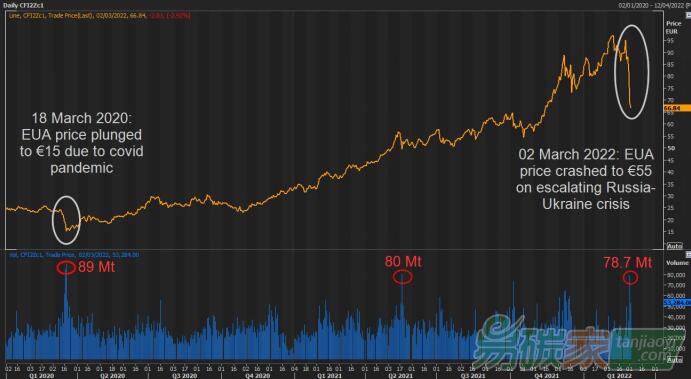 碳市場,投資者紛紛減倉和大幅甩賣碳配額。3月1日,碳價暴跌近20%,12月期貨交易量則高達7870萬噸。這幾乎是EUA標桿合約日交易量的歷史最高水平,接近于2020年3月18日的8900萬噸日交易量。