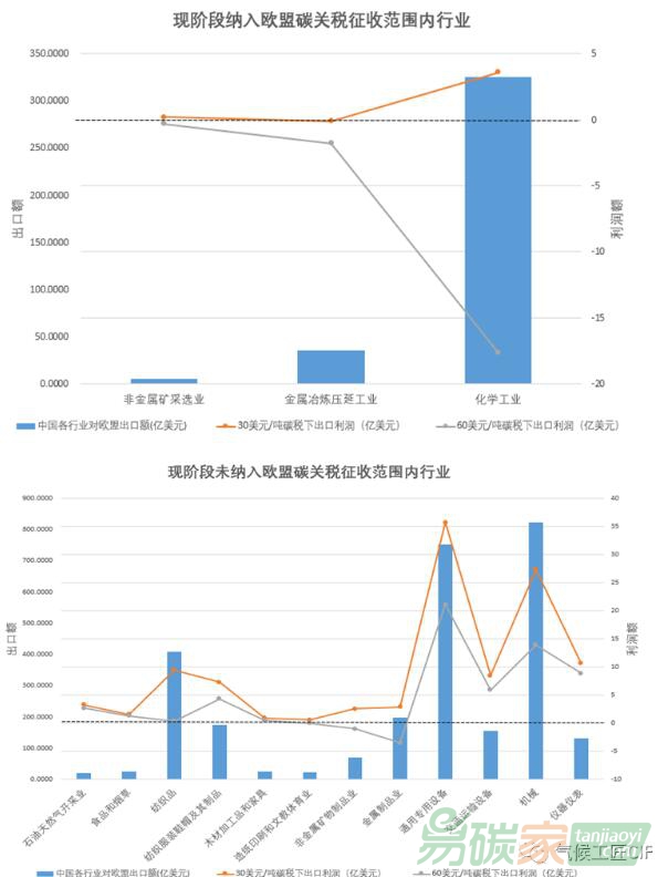 碳市場在2021年底的收盤價已漲至73.28歐元/噸。在完全取消免費配額的情景下,當(dāng)前,歐盟碳價為76歐元/噸(折合人民幣約530元/噸),我國碳價為57元/噸,以鋼鐵行業(yè)為例,我國噸鋼碳排放量約為1.7~1.8噸,歐盟碳關(guān)稅的實施后,預(yù)計我國出口鋼材將支付800~850元/噸的碳排放費用,高于每噸鋼鐵歷年的平均利潤。據(jù)高盛集團(tuán)預(yù)計,在100美元/噸CO?的碳稅下,中國對歐盟總出口將可能被征收高達(dá)350億美元每年的碳邊境調(diào)節(jié)稅,約占我國每年出口歐盟總額的7.7%[2],高昂的碳關(guān)稅將顯著影響我國高碳出口產(chǎn)品的價格優(yōu)勢。從圖1可知,當(dāng)歐盟以60美元/噸高征稅標(biāo)準(zhǔn)對中國出口貿(mào)易中的隱含碳征收碳關(guān)稅時,已納入現(xiàn)階段碳稅征收范圍的非金屬礦采選業(yè)、化學(xué)工業(yè)和金屬冶煉壓延工業(yè)的產(chǎn)品出口利潤為負(fù),對歐盟出口將成為企業(yè)的不利選擇。且非金屬礦物制品業(yè)、金屬制品業(yè)、紡織品、