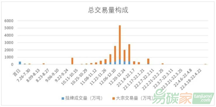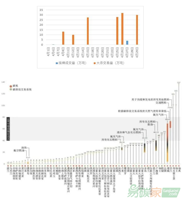 特別是4月份以來,全國碳市場交易可用“蕭條”來形容(圖2)。全月配額總成交量145萬噸,總成交額8259.58萬元,僅占年配額總量的萬分之三。其中,掛牌交易量4.5萬噸,月成交額268.59萬元;大宗交易量140.5萬噸,月成交額799.09萬元,占當(dāng)月總交易量的96.87%。全月19個交易日中,成交量不足100噸的交易日達(dá)到11個,其余交易日如果沒有幾筆大宗交易來拯救,市場可謂一片死寂。交易的不活躍也反映在價格曲線上,4月份掛牌交易價格K線基本成一條直線,大部分交易日都是60元一個價格,大概率當(dāng)日僅一筆“做價”的小額交易,在交易活躍度極低的情況下,配額價格雖然“穩(wěn)定”但并不真實(shí)。