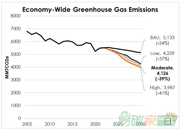 在參考情景(BAU)下(即包括迄今為止所有頒布的聯(lián)邦和州的政策),模型預(yù)測2030年美國的排放量將比2005年的水平減少24%。