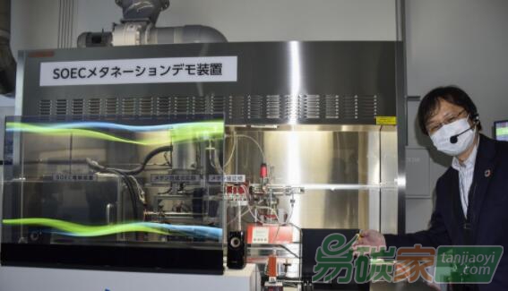 大阪燃?xì)馊涨霸诖筅媸袃?nèi)的研究設(shè)施展示了用于研究的小型甲烷化設(shè)備,把合成甲烷時(shí)產(chǎn)生的反應(yīng)熱等用于制氫,以實(shí)現(xiàn)高能效。在有效利用反應(yīng)熱的同時(shí)提高電解水制氫時(shí)的溫度,以此削減所需的可再生能源