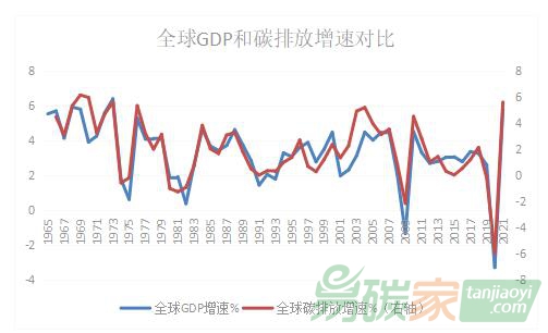 電力、石油等能源的需求,而電力生產(chǎn)、石油、天然氣等化石能源使用都會產(chǎn)生大量碳排放。例如,從1965年至19世紀(jì)中葉,發(fā)達(dá)國際的工業(yè)化進(jìn)程推動經(jīng)濟(jì)的快速增長,這個時期的碳排放總量也呈現(xiàn)快速上升趨勢。而經(jīng)濟(jì)衰退時期,能源使用量下滑,碳排放量也同樣出現(xiàn)階段性下滑,例如,20世紀(jì)70年代的兩次石油危機(jī),2008-2009年由美國次貸危機(jī)引發(fā)的世界經(jīng)濟(jì)危機(jī)、2020年新冠疫情,都帶來了碳排放總量的零增長或下降。而在危機(jī)之后的經(jīng)濟(jì)復(fù)蘇中,碳排放則會出現(xiàn)恢復(fù)性的高增長。從表2可以看出,2021年七大經(jīng)濟(jì)體的碳排放比2020年都有一定規(guī)模增長。從圖3也可以看出碳排放的增長隨經(jīng)濟(jì)增長波動。當(dāng)然,隨著能源結(jié)構(gòu)的調(diào)整,碳排放增長與經(jīng)濟(jì)增長的關(guān)系趨向弱化。