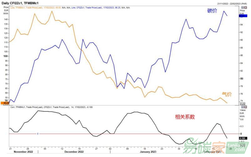 碳配額來套現(xiàn)提高流動性。此外,沖突升級和對于歐洲經(jīng)濟形勢的擔憂也使得機構投資者減少對歐元掛鉤資產的敞口,出售碳配額。下圖顯示了近期內碳價和氣價的走勢以及相關系數(shù),近期內跌落至負值。這反映了,氣價下跌,使得企業(yè)或者投資機構獲得了多余的資金,可以來采購碳配額,推高了碳價,二者負相關。這也反映了近期氣價暴跌,碳價上漲,主要還是碳