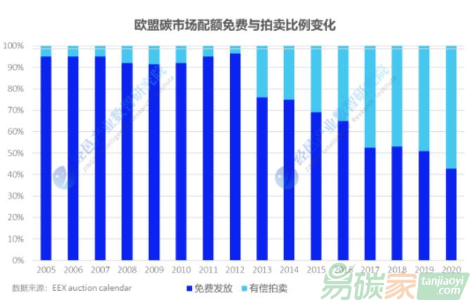 市場(chǎng)的免費(fèi)配額比例是不斷縮減的:第一階段(2005-2007)免費(fèi)配額95%,期末碳價(jià)跌至接近0歐元/噸;第二階段(2008-2012)免費(fèi)配額90%,有償拍賣額度10%,同期碳價(jià)僅10歐元/噸;第三階段(2013-2020)免費(fèi)額度以年均1.74%的幅度縮減,碳價(jià)從5歐元/噸上漲至32歐元/噸;第四階段(2021-2030)有償拍賣額度已大于50%,免費(fèi)額度以年均2.2%的幅度繼續(xù)縮減,截至2021年碳價(jià)已飆升至55歐元/噸。可見,免費(fèi)配額供給量的適時(shí)縮減與有償