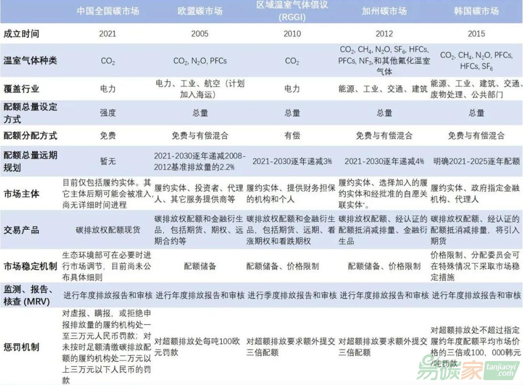 政策框架仍處于發(fā)展完善階段。下表為我國與國際主要碳市場的對比。