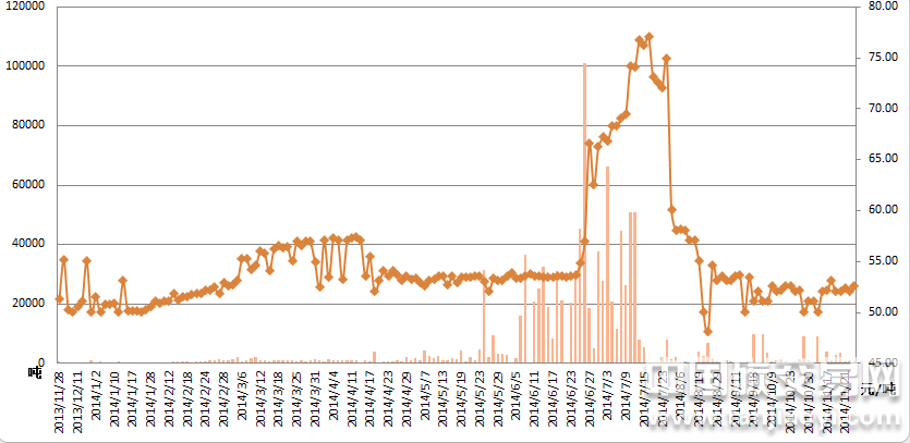 從全年走勢來看,2013年市場起步階段的成交比較分散,偶然性很大。除開市當(dāng)天外,僅達(dá)成7筆交易,均量不足300噸/天。進(jìn)入2014年,交易明顯活躍,尤其是處于履約關(guān)鍵期的5月、6月和7月。三個月的合計(jì)交易量達(dá)到190萬噸,約占全年90%。期間,價格也從50元/噸波動上漲至70元/噸附近,最高時達(dá)到80元/噸。隨著履約工作的結(jié)束,價格又逐步回落至50-55元之間。