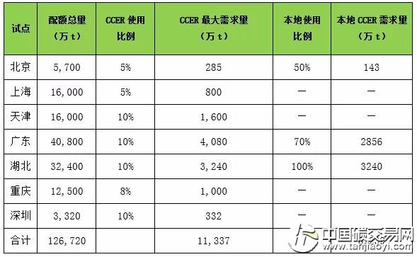 北京等三個試點(diǎn)還分別規(guī)定了100%、70%及50%的本地使用限制。根據(jù)各碳交易試點(diǎn)的年度配額總量與抵消規(guī)則,大致可以計算出各試點(diǎn)市場對CCER理論上的最大需求量及本地需求量,具體信息見下表。