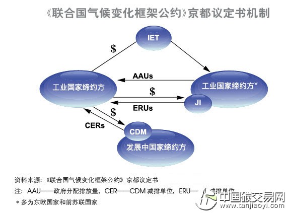 國際排放貿易機制(ET),是指發(fā)達國家(《京都協議書》附件一國家)將其超額完成的碳減排義務指標,包括『排放減量單位』、『排放減量核證』、『分配數量單位』(Assigned Amount Unit,AAUTs)、『清除單位』(Removal Unit,RMUs)等碳減排單位核證,以貿易方式(而不是項目合作的方式),直接轉讓給另外一個未能完成碳減排義務的發(fā)達國家。