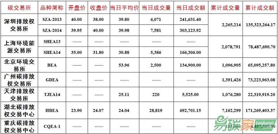 品種SZA-2013成交6,071噸,成交額241,631.40元,開(kāi)盤(pán)價(jià)40.00元,最高價(jià)44.89元,最低價(jià)37.50元,收盤(pán)價(jià)38.00元,較前一交易日下跌7.88%。品種SZA-2014成交7,581噸,成交額303,123.92元,開(kāi)盤(pán)價(jià)39.95元,最高價(jià)40.00元,最低價(jià)39.30元,收盤(pán)價(jià)40.00元,較前一交易日上漲0.13%。截止當(dāng)日,深圳碳