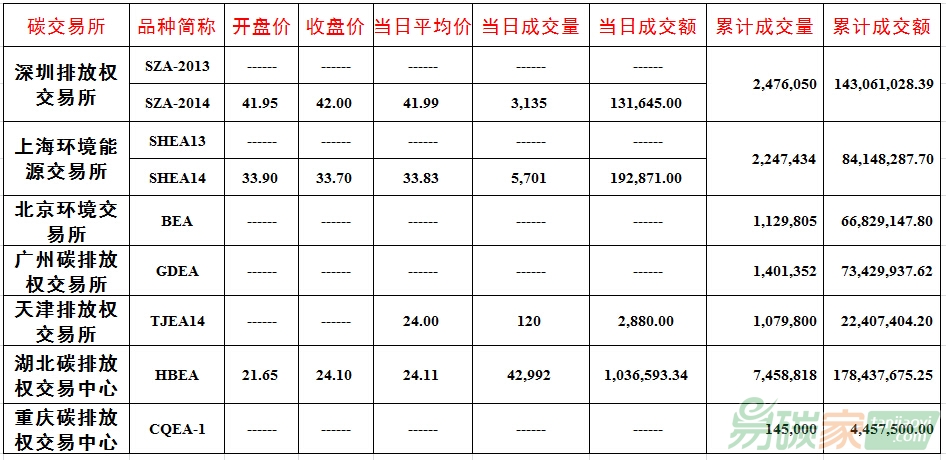 品種SZA-2014成交3,135噸,成交額131,645.00元,開盤價41.95元,最高價42.00元,最低價41.95元,收盤價42.00元,較前一交易日上漲0.12%。截止當(dāng)日,深圳碳