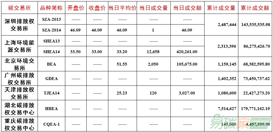 品種SZA-2014成交1噸,成交額46.09元,開盤價46.09元,最高價46.09元,最低價46.09元,收盤價46.09元,較前一交易日上漲10.00%。截止當日,深圳碳