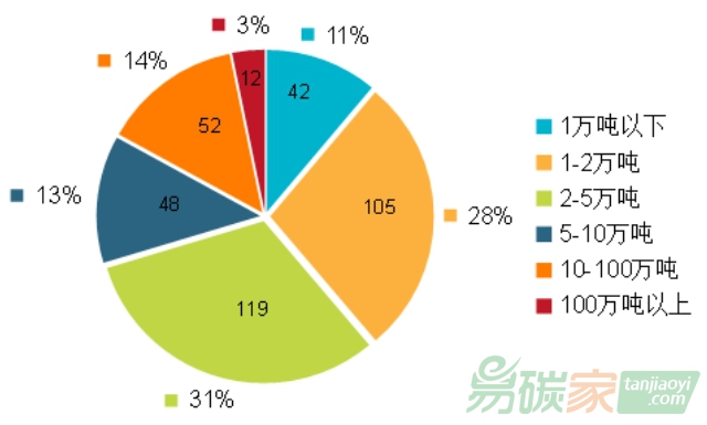從排放規(guī)???,2023年度378家納管企業(yè)中,排放量在100萬噸以上的企業(yè)共12家,占比3.2%;排放量介于10萬噸到100萬噸的企業(yè)共52家,占比13.8%;大部分企業(yè)排放量在1萬噸到5萬噸之間,共有企業(yè)224家,占比59.3%。