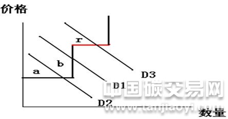 除價格控制外,還可以通過政府排放權(quán)儲備(allowance reserve)來調(diào)節(jié)。Murray等(2008)設(shè)計了加入排放權(quán)儲備的價格上、下限機制:如果政府免費發(fā)放排放權(quán),價格下限就是排放權(quán)最低轉(zhuǎn)讓價;如果政府通過拍賣發(fā)放排放權(quán),就設(shè)定拍賣底價。在設(shè)定最高價格時,管理機構(gòu)掌握的排放權(quán)儲備可形象地稱為“安全閥”(safety valve, Jacoby & Ellerman,2004)。當企業(yè)需要更多的排放權(quán),可向政府支付一定價格購買。排放權(quán)儲備須有數(shù)量限制,否則過量發(fā)放會降低企業(yè)減排動力。如圖1所示,D1,D2,D3表示不同水平的排放權(quán)需求:當需求為D1時,需求的增減只要在b段內(nèi),由于排放權(quán)供給總量不變,將影響市場價格。如果需求下降到D2,在供給曲線a段,價格下限將起作用。如果需求上升到D3,管理機構(gòu)投放規(guī)模為r的排放權(quán)儲備,可平抑價格,原價格上限不會被突破。但排放權(quán)儲備畢竟有限,若需求繼續(xù)上升,市場供求將導(dǎo)致排放權(quán)交易價提高。
