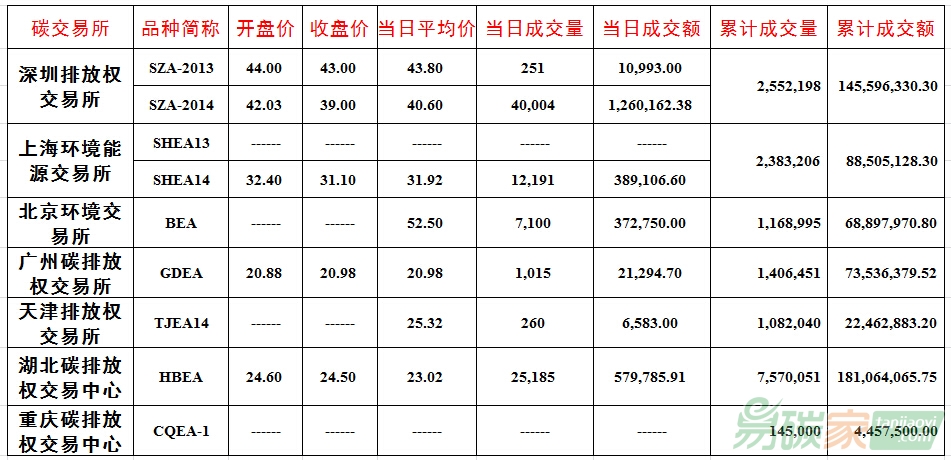 品種SZA-2013成交251噸,成交額10,993.00元,開盤價(jià)44.00元,最高價(jià)44.00元,最低價(jià)43.00元,收盤價(jià)43.00元,與前一交易日持平。品種SZA-2014成交40,004噸,成交額1,260,162.38元,開盤價(jià)42.03元,最高價(jià)42.35元,最低價(jià)39.00元,收盤價(jià)39.00元,較前一交易日上漲1.30%。截止當(dāng)日,深圳碳