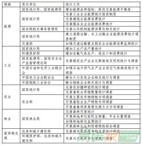 交通運(yùn)輸行業(yè)的能源統(tǒng)計(jì);健全工業(yè)產(chǎn)品產(chǎn)量及含氟氣體生產(chǎn)、進(jìn)出中和消費(fèi)統(tǒng)計(jì),健全高排放行業(yè)相關(guān)的統(tǒng)計(jì)與調(diào)查;完善農(nóng)業(yè)、土地利用變化及林業(yè)、廢棄物處理相關(guān)統(tǒng)計(jì)與調(diào)查。由于完善溫室氣體排放基礎(chǔ)統(tǒng)計(jì)工作涉及多部門與協(xié)會(huì),意見(jiàn)制定了詳細(xì)的責(zé)任分工。