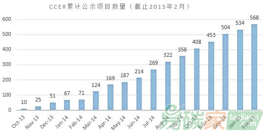 第三方審定與核證機構(gòu),為CCER項目的開發(fā)、審定與核證奠定了基礎(chǔ)。隨著2013年10月中國自愿減排交易信息平臺的悄然上線,CCER項目開始逐漸步入正軌,平臺上公示的項目開始逐漸增多,2014年春節(jié)過后至今每月平均公示的項目超40個,截止2015年2月底累計公示項目達(dá)568個(見下圖)。