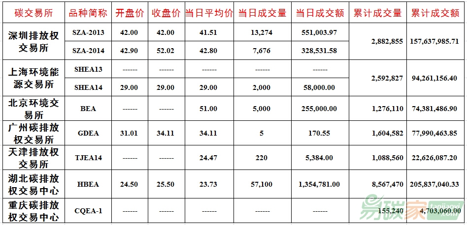 品種SZA-2013成交13,274噸,成交額551,003.97元,開盤價(jià)42.00元,最高價(jià)44.17元,最低價(jià)37.50元,收盤價(jià)42.00元,較前一交易日上漲4.61%。品種SZA-2014成交7,676噸,成交額328,531.58元,開盤價(jià)42.90元,最高價(jià)52.02元,最低價(jià)42.56元,收盤價(jià)52.02元,較前一交易日上漲10.00%。截止當(dāng)日,深圳碳市場(chǎng)配額總成交量2,882,855噸,總成交額157,637,985.71元。